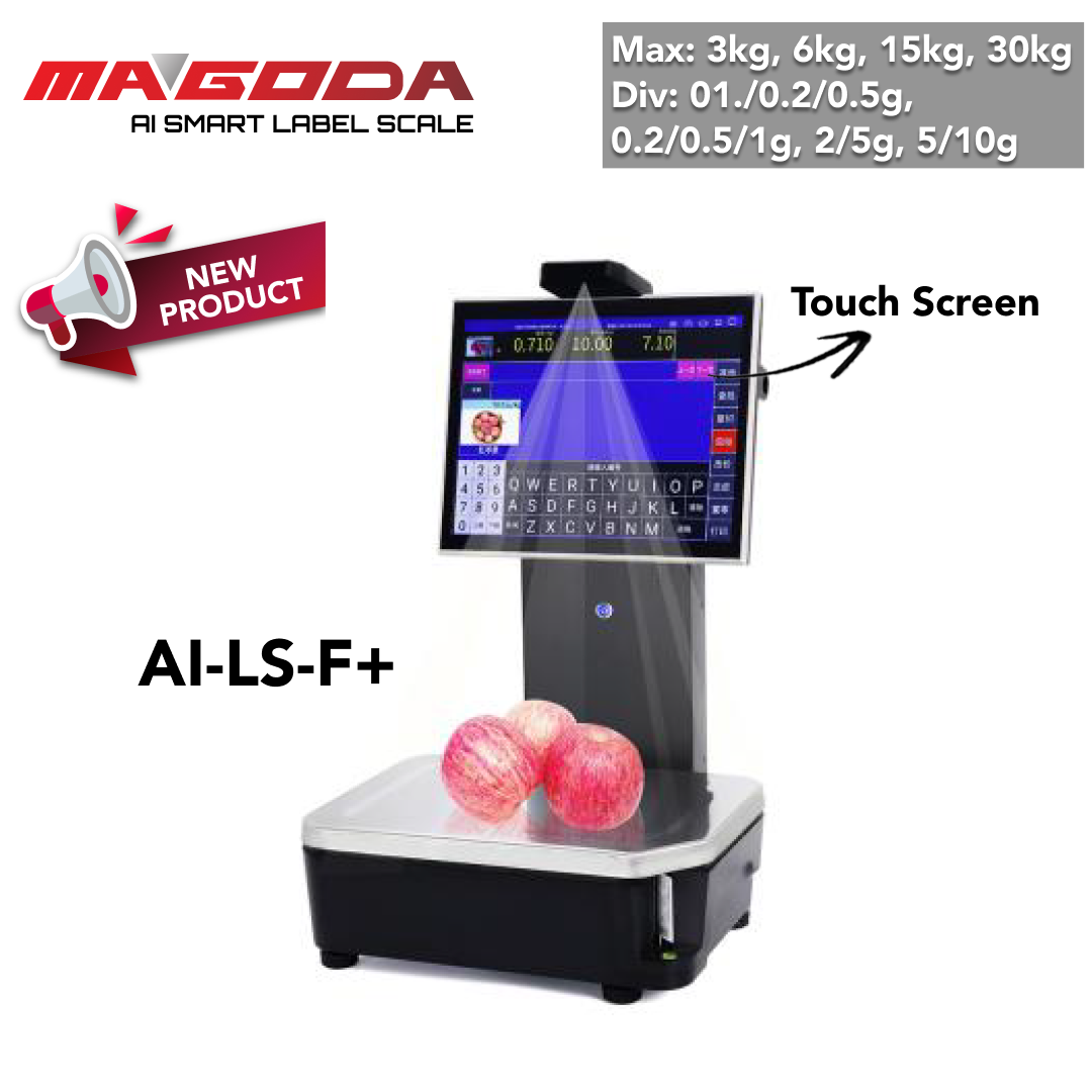 MAGODA AI Smart Weighing Scale is the newly introduced product by Magoda. AI Label Scale have 2 type (touch screen with keyboard / fully touch screen). Material : Cast aluminum structure, good heat dissipation efficacy, memory : 2gb RAM, software : it supports all the supermarket software on the market in a compatible way.
