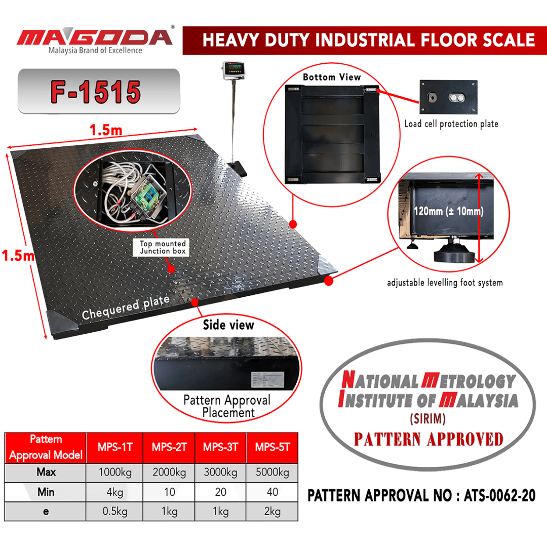 Offering you a complete choice of industrial / commercial Heavy Duty Industrial Floor Scale with NAWI Pattern Approval Compliance which include a platform (1.5m x 1.5m), optional MAGODA indicators : E-series indicators(Economical), M-series indicators(Super Large display) & HP-series(High Precision) and pole with U-bracket.